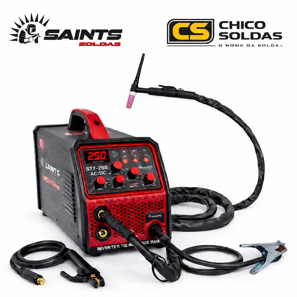 Máquina de solda TIG inversora AC/DC - MMA, leve, portátil e muito versátil. Com este equipamento é possivel a soldagem de praticamente todos os tipos de metais, devido ás caracteristicas técnicas do seu arco elétrico em AC-corrente alternada, utilizada principalmente na soldagem do Alumínio, Magnésio e suas ligas.